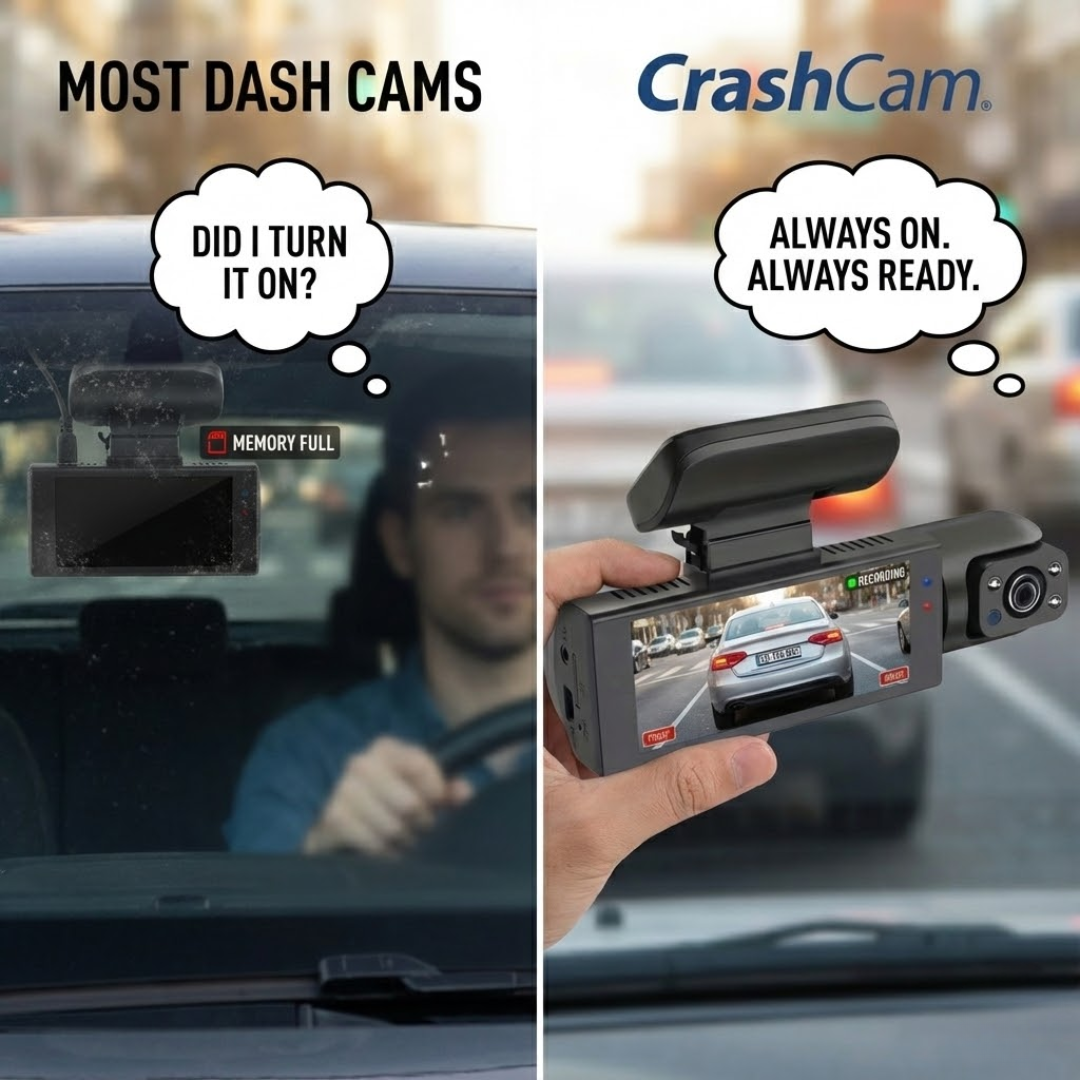 Here's what happens with most dash cams: You forget to turn it on. You forget to clear the memory. You forget it exists until the day you need it and realize it captured nothing. CrashCam uses automatic loop recording. It starts when you start your car. It records over old footage when the card fills up. It never takes a day off. The one time you need proof, it's there. Waiting. Ready. Like a silent guardian who's been watching the whole time.