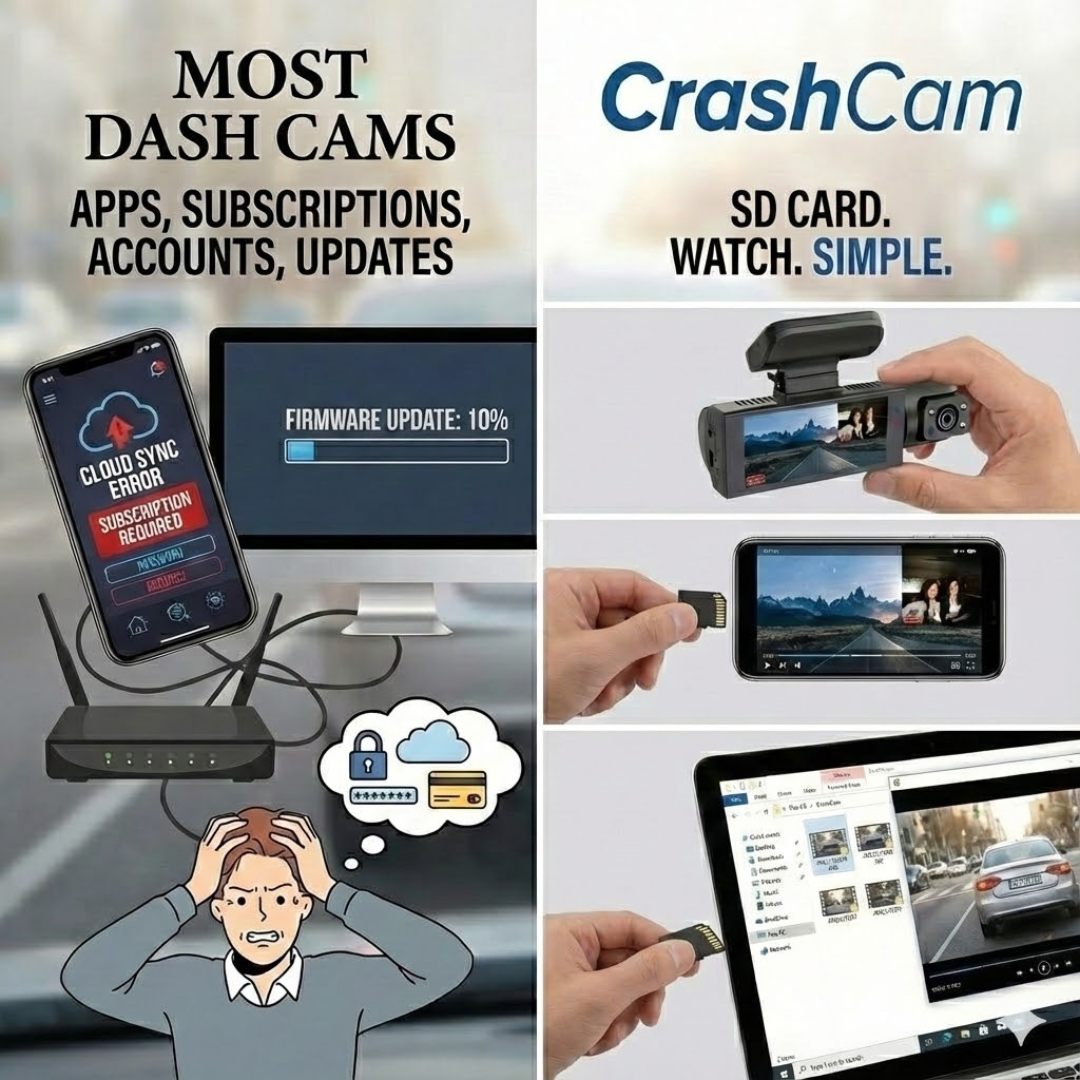 Some dash cams require proprietary apps, monthly subscriptions, cloud accounts, firmware updates, and a computer science degree to access your own footage. CrashCam? Pop out the SD card. Plug it into any computer. Watch your videos. That's it. No passwords. No subscriptions. No "connectivity issues." No calling customer support because the app crashed. Just simple, instant access to your footage when you need it most, which is usually when you're already stressed, already frustrated, and don't have time for technology to fail you.