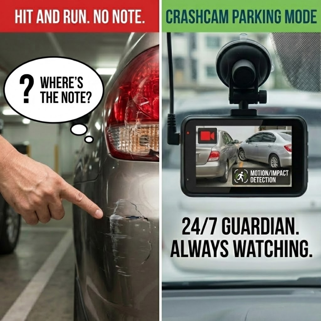 You come back to your car. There's a dent. A scrape. A cracked taillight. And no note. No witness. No way to prove anything. Just a repair bill and a sinking feeling. CrashCam's parking mode activates when your car is stationary, triggered by motion or impact. So while you're in the grocery store, the gym, the office, the restaurant, your camera is standing guard. Watching. Waiting. Ready to catch the coward who hits and runs.